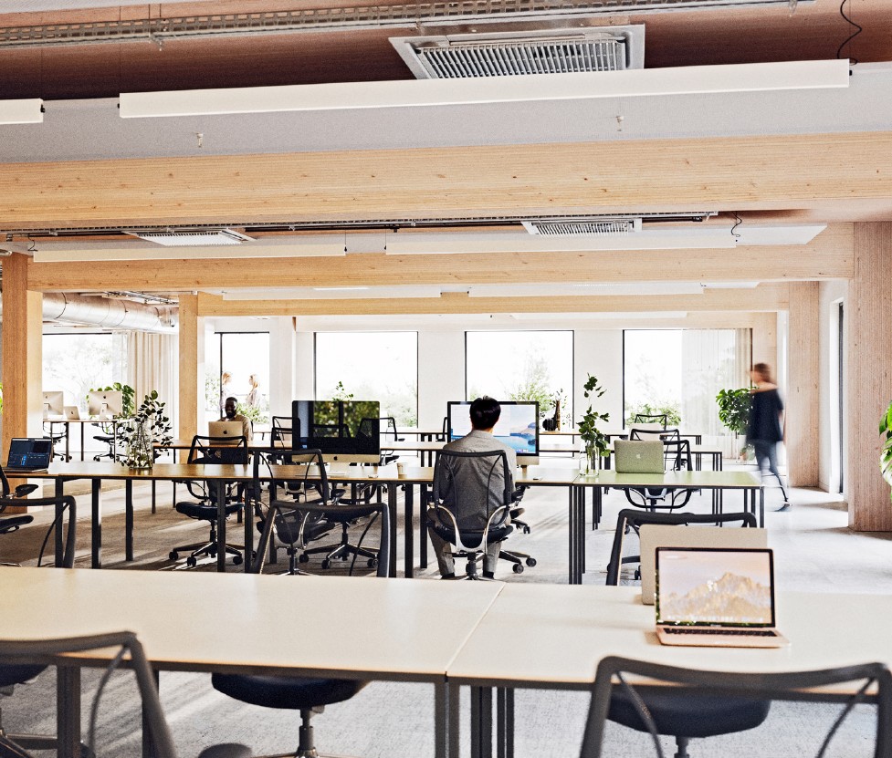 Trehus is a new timber-framed building with very high environmental ambitions, targeting net zero carbon emissions, BREEAM Outstanding and 3* Fitwel ready. The timber structure provides a lower carbon footprint over conventional concrete offices, as well as accrued over the building's lifetime through low energy usage.